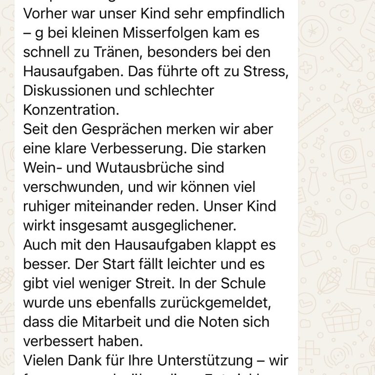 Jede Beratung ist einzigartig, und es berührt mich immer wieder, zu sehen, wie Mütter, Kinder und Familien durch unsere Unterstützung wachsen. Hier sind einige Rückmeldungen von Menschen, die ihren Weg mit mir gegangen sind.